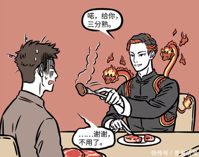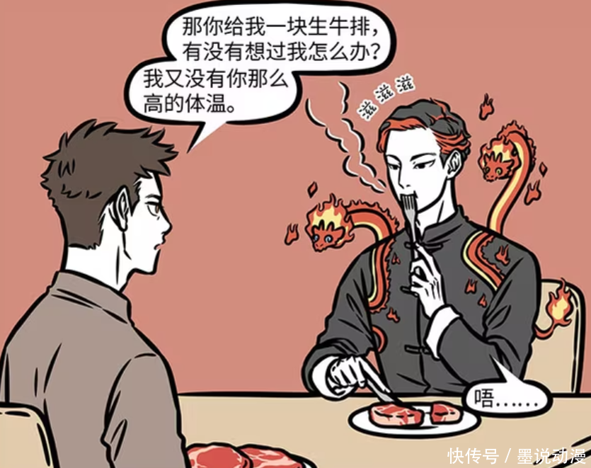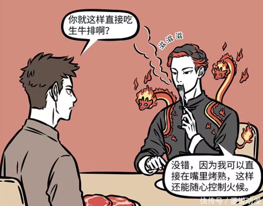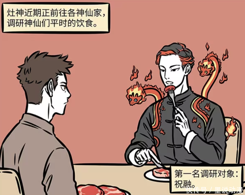 灶王爷最近频频赶赴诸位伟人的家里,只为望望他们时时吃什么。这一次灶王爷来到火神回禄家,那么他在吃什么?不错看出回禄在吃西餐,对刀叉使用倒是很驾轻就熟。至于吃的食品,等于牛排。