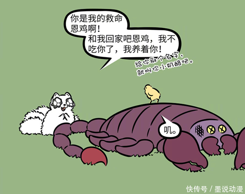 就这样,小鸡成了十一月的救命恩东说念主(鸡),他还让小鸡随着我方回家。十一月暗意以后不会吃小鸡,并且要养着他。十一月还给小鸡取了名字,就叫小奶酪。看起来这只小鸡很心爱这个名字,那么这只超大号蝎子要怎么处理?