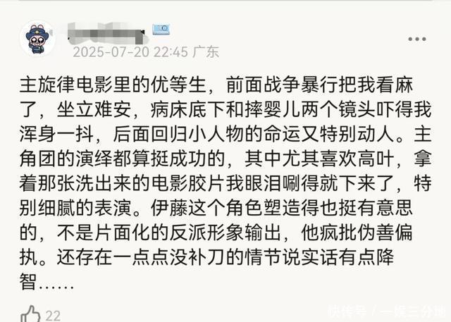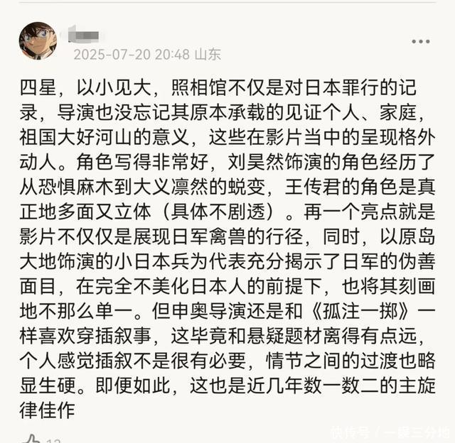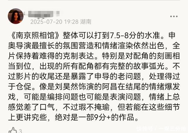 其一,口碑爆了。 《南京照相馆》通过一家小小照相馆的视角,串联起历史激流中的东谈主性故事。导演申奥这次拍得很斗胆,既有千里重的历史反念念,又有遍及的情感描摹。 主演声势更是豪华,刘昊然、王传君等东谈主把变装演得言简意该,尤其是刘昊然饰演的年青摄影师,那种在战火中对抗的矍铄和慈爱,胜利戳中了不雅众的泪点。 影片收尾的激越戏份,许多不雅众看完都忍不住泪目,影评里尽是“心碎又触动”“哭到喘不外气”的评价。