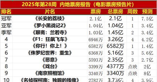 同期,这两部影片的爆发, 让陈佩斯出了龙潭又进虎穴 ,这到底是奈何一趟事呢? 内地票房:《长安的荔枝》夺冠,《南京照相馆》点映票房3340万 工夫来到了7月下旬,2025年暑期档进度处于尖锐化阶段,但和旧年比拟,本年的确太惨了,毕竟旧年这个档期还爆出了《默杀》和《抓娃娃》两部影片,一部13.4亿,一部32.5亿。 而本年暑期档,国产片开局不利,被《名窥察柯南》最新戏院版、《F1狂飙飞车》和《侏罗纪世界4》等引进片围起来打。 先是陈可辛的《酱园弄悬案》运转热度高的吓东谈主,可票房却低到可怕;被交付厚望的陈念念诚悬疑片《坏心》,也未能掀翻不雅影柔软;饶晓志的高口碑IP新作《无名之辈否往泰来》上映即扑街;就连追光动画《聊斋兰若寺》都创下了该公司票房新低。
