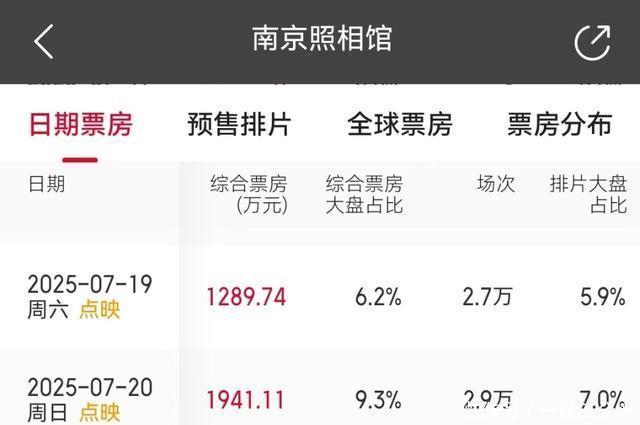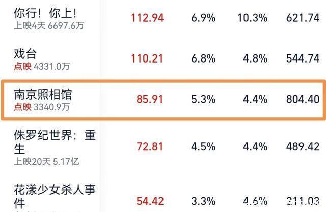 这时候,不雅众把视力放到《南京照相馆》上了。此片点映票房十分出彩,笼统数据如下: 7月19日点映首日排片5.9%,上座率11.5%,拿到1289万票房; 7月20日点映第二天排片飞腾到7%,上座率攀升到15.6%,日票房为1941万。 上座率在同档期排名第一,点映票房呈现逆跌姿态,最要津的是口碑释出之后,不雅众都赐与极高的评价, 啡哥以为《南京照相馆》爆了,主要体当今口碑和票房上头。