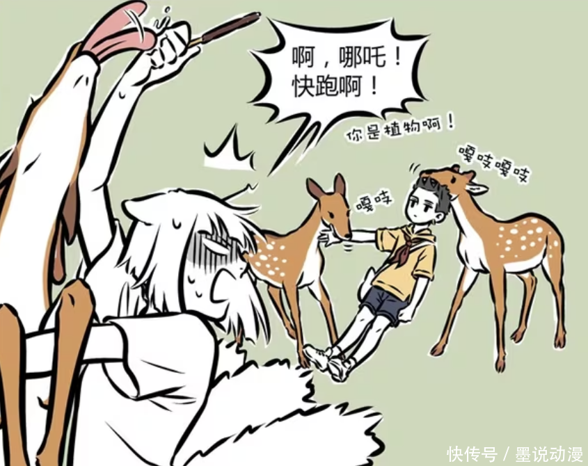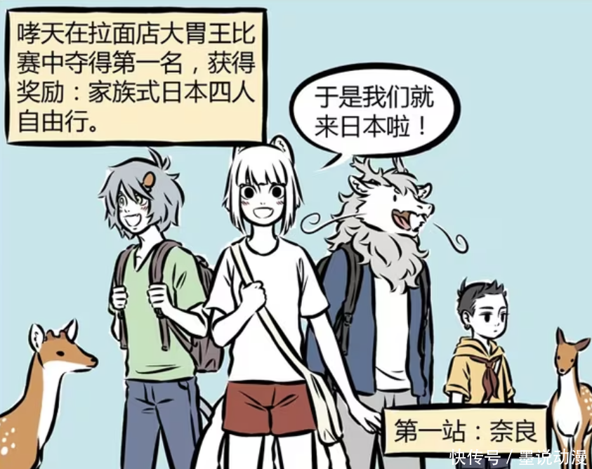 《非东说念主哉》漫画版中,主角团不绝统共去旅行,偶尔也会放洋。这一次去日本,统统是哮天在大胃王比赛中夺冠,刚好有四个去日本的限额。敖烈、九月和哪吒也因此跟他曩昔。不外遭受奈良鹿之后,九月和敖烈被抢夺食品,哪吒差点被它们吃掉。