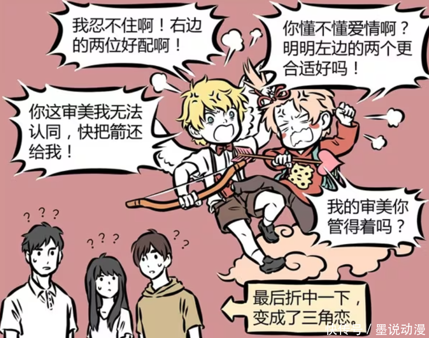 丘比特示意我方忍不住,他合计在路上的两男一女,右边的两位好配。媒妁合计,明明是左边两个更适当。媒妁和丘比特的审好意思是都备不同,谁都确信谁。媒妁夺走丘比特的箭,丘比特则是扯媒妁的红绳。这样一来,因为两神竞争,效果导致三东谈主酿成了三角恋。