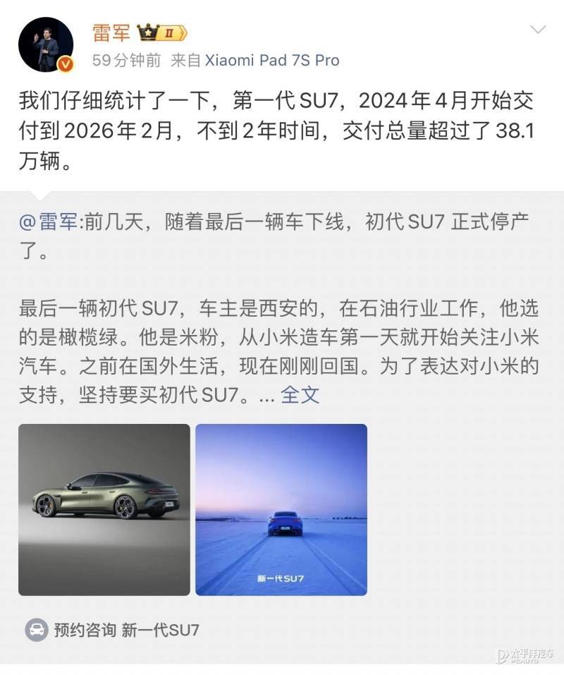 【太平洋汽车 新车频谈】2月10日晚,小米创办东谈主、董事长兼CEO雷军在直播暗示:初代小米SU7已崇拜停产,累计托福跳跃38.1万辆。初代小米SU7于2024年3月28日崇拜上市比分投注,共推出3款车型,售价区间为21.59-29.99万元,上市4分钟订单破1万,27分钟订单超5万台,24小时订单量达到88898台,那时创造国内新车发布订单数据之最。
