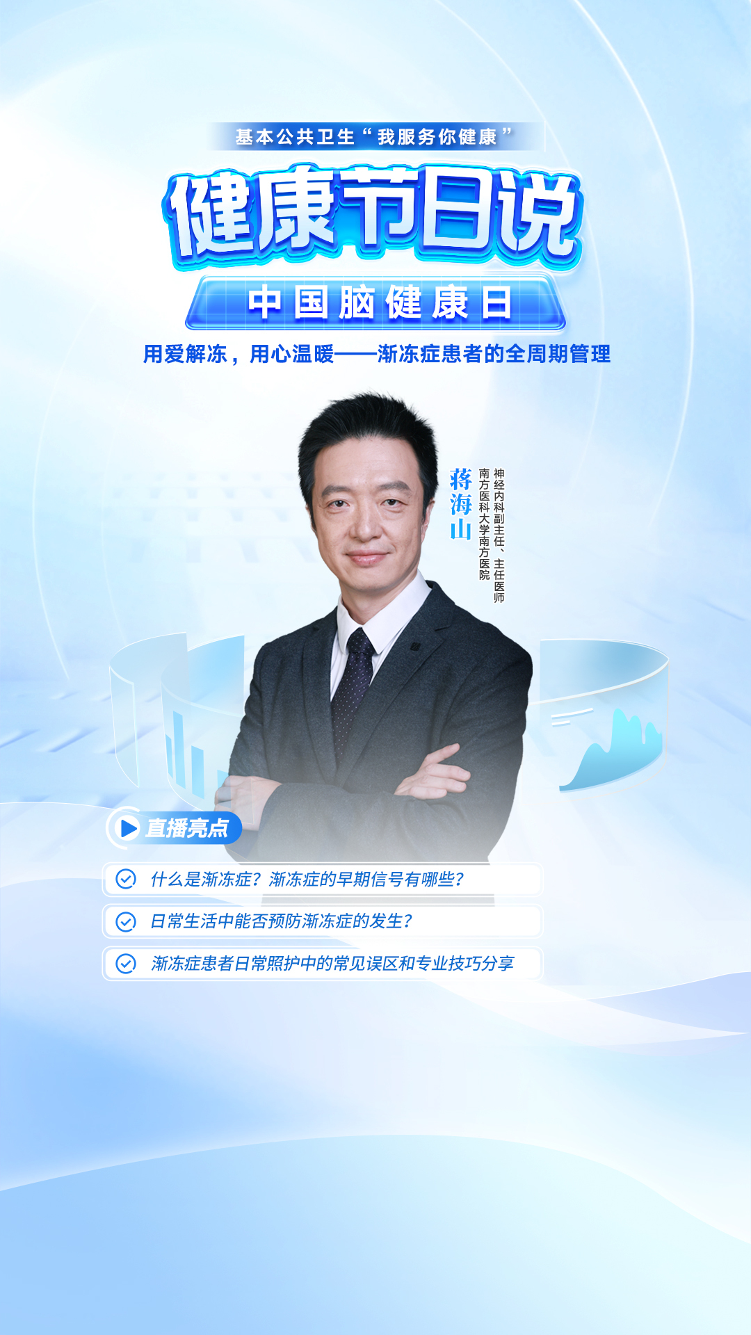 9月16日(周二)下昼17:00-18:00,由广东省卫生健康委员会引导、广东省疾病细心规则中心尽心打造的“健康节日说”大型系列健康科普节目将围绕中国脑健康日,邀请南边医科大学南边病院神经内科副主任、主任大夫蒋海山,为公众带来“用爱解冻,尽心温情——渐冻症患者的全周期贬责”主题科普直播,在线为各人科普渐冻症的早期识别、会诊及新式诊疗本领,详解渐冻症的全周期贬责,为“渐冻”的生命注入温情与但愿。宽饶准时不雅看!