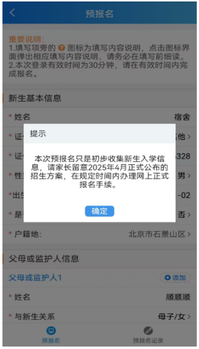 “报读意向”信息填完后,家长不错点击提交按钮,系统会泄漏“预告名信息浏览”的页面。家长仔细查验填写的信息是否填写无理,如若填写无理,可点击“复返修改”;如若填写的信息全部正确,可点击“说明并提交”。如图所示。当点击“说明并提交”后,系统会弹出“预告名”奏效的相应教导,如图所示。