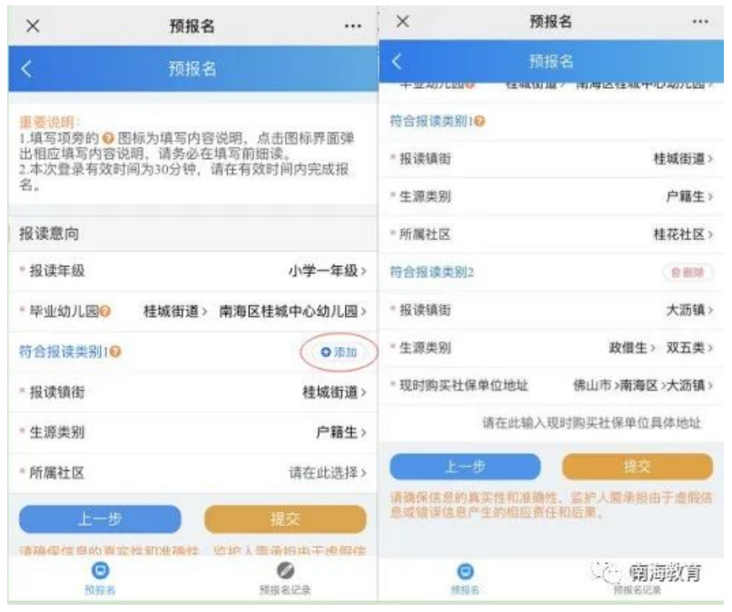 填写父母或监护东说念主信息,点击下一步,采用报读年纪、报读镇街、生源类别、在报读意向页面,采用报读年纪后,采用更生所毕业的幼儿园或小学。在“允洽报读类别1”信息栏下,采用报读镇街后,采用生源类别,采用所属社区。如若家长需要选报两种报读类别,可点击“添加”按钮,即可填写两个报读类别信息,如图所示(注:不明晰所属社区的可相关当地村居)。