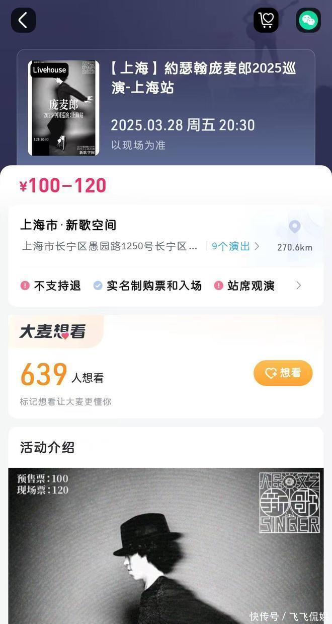 据了解,该场献艺为无座位全站席不雅演,预售票价钱100元,全价票价钱120元,每个订单最多可以购买6张票,新歌空间场面简短可以容纳四百东说念主傍边。在3月17日场面责任主说念主员长远已出售了300多张门票,该责任主说念主员示意这个上座率很可以,因该场献艺售票平台不相沿退款,一般而言买了票的不雅众齐会去不雅看献艺。面前上海新歌空间有9场音乐献艺正在售票中,庞麦郎上海站献艺有639东说念主标注了念念看,这亦然新歌空间面前唯独一个售罄的献艺。