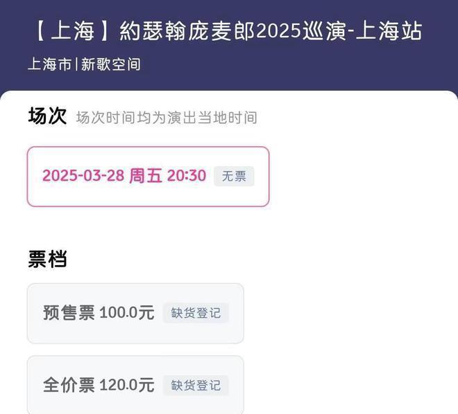 3月19日赛事胜负,记者从大麦票务发现,权术在3月28日于上海新歌空间livehouse举行的约瑟翰·庞麦郎2025巡演上海站门票当今依然沿路售罄,大麦自大为缺货登记景况。