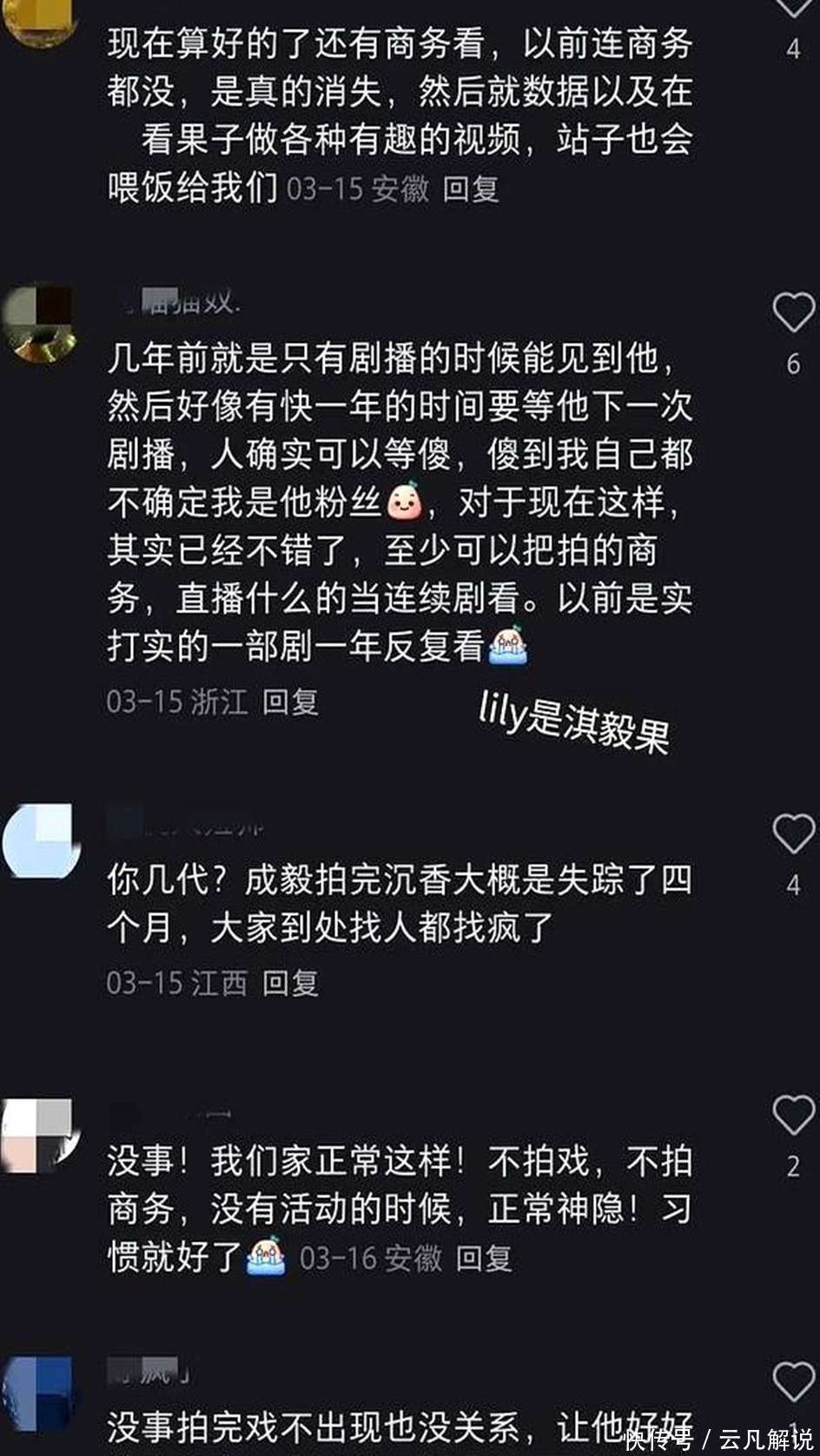 《千里香如屑》终了后,成毅接了新戏《底线》,然后又隐没得九霄,这一隐没即是四个月。在这四个月里,粉丝们只可靠着刷他过去的剧来渡过漫长的恭候时光。不外,粉丝们并莫得因此而恼恨或者脱粉,反而愈加爱护与他相处的每一个一忽儿。这少量,和那些因为少量风吹草动就和偶像闹得不成开交的粉丝群体酿成了昭彰的对比。