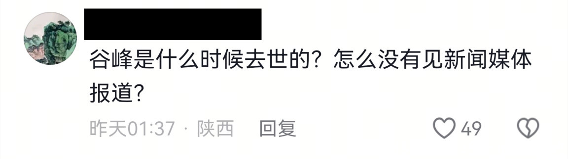 算作关心到谷峰先生逝世的一员,但愿谷峰先生的家东谈主节哀,但愿他们早日走出伤痛。