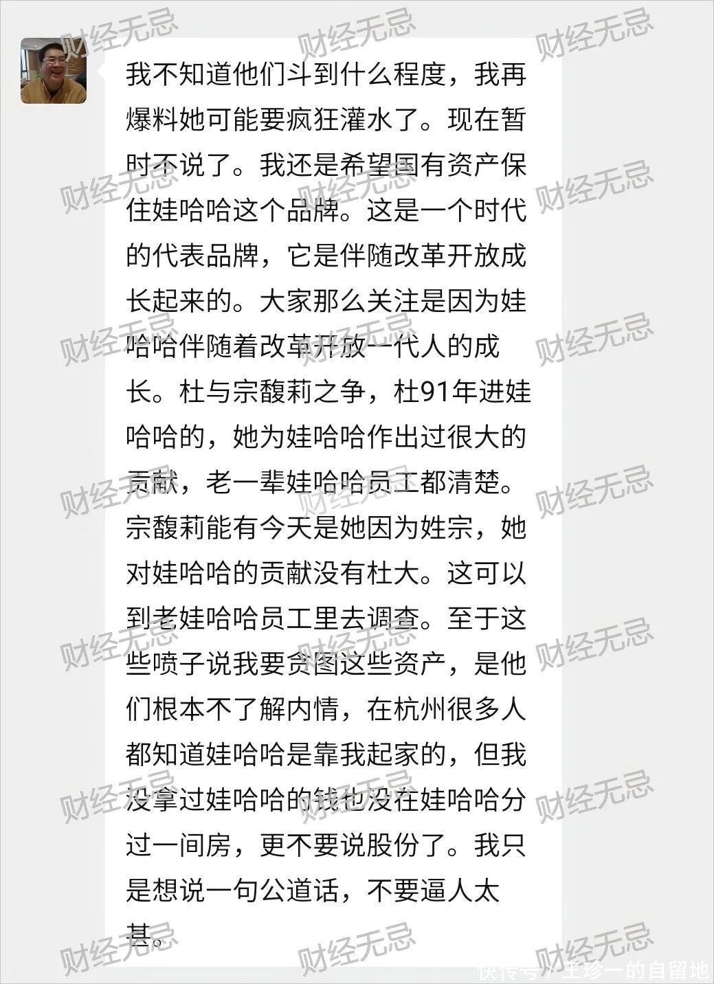 7月17日,他又说宗馥莉抢了叔叔和姑妈公司的业务,不与宗家东谈主往来。他还说宗馥莉对娃哈哈的孝敬不如杜建英,并浮现宗庆后布鞋首富,一妻一女的东谈主设是宗馥莉打造的。
