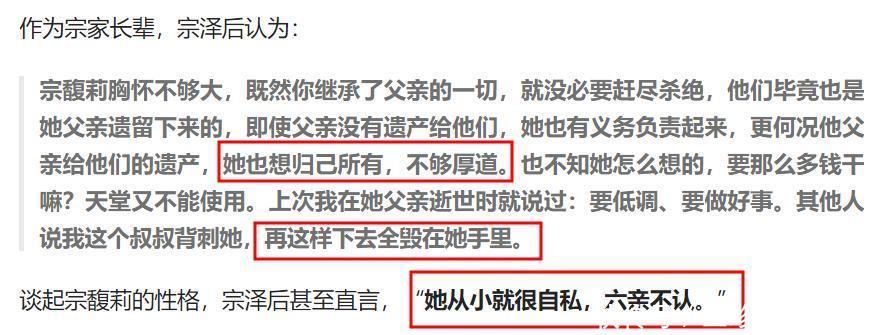 她说宗庆后莫得将不偏不倚,生前莫得将遗产安排好,甚至于他离世后,给孩子们埋下了许多雷。
