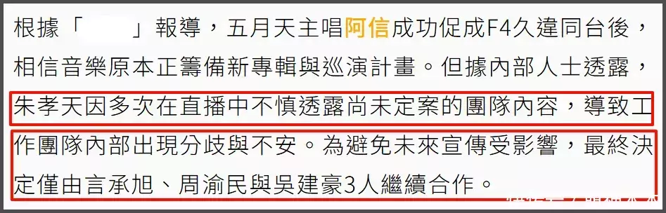 但F4早年就曾埋下过队内不和的听说,不出偶然的话,竟然也曾出偶然了。先是朱孝天初度合体惹出“上春山”争议,其后他在直播中作念出了阐述,第二场扮演也卖力展现团魂。