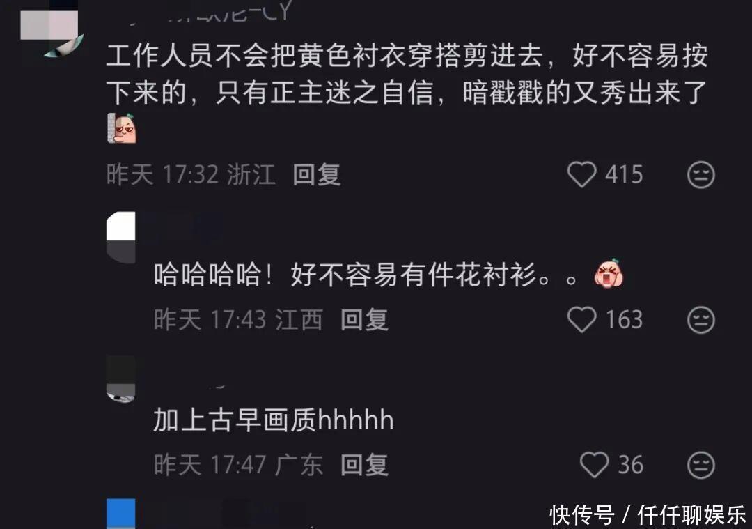更有果果精确吐槽:“职责主说念主员才不会把那件黄衬衣剪进去!独一正主迷之自信,还暗搓搓地秀出来!”