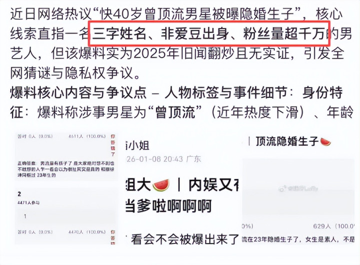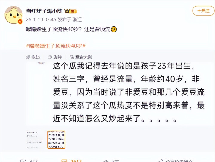 爆料称圈内有一位“快40岁曾顶流男星被曝隐婚生子”。