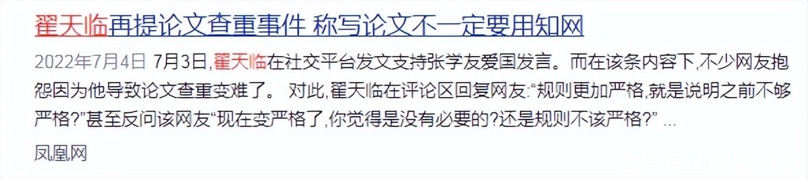 尊府参考:2022-07-04凤凰网——翟天临再提论文查重事件 称写论文不一定要用知网