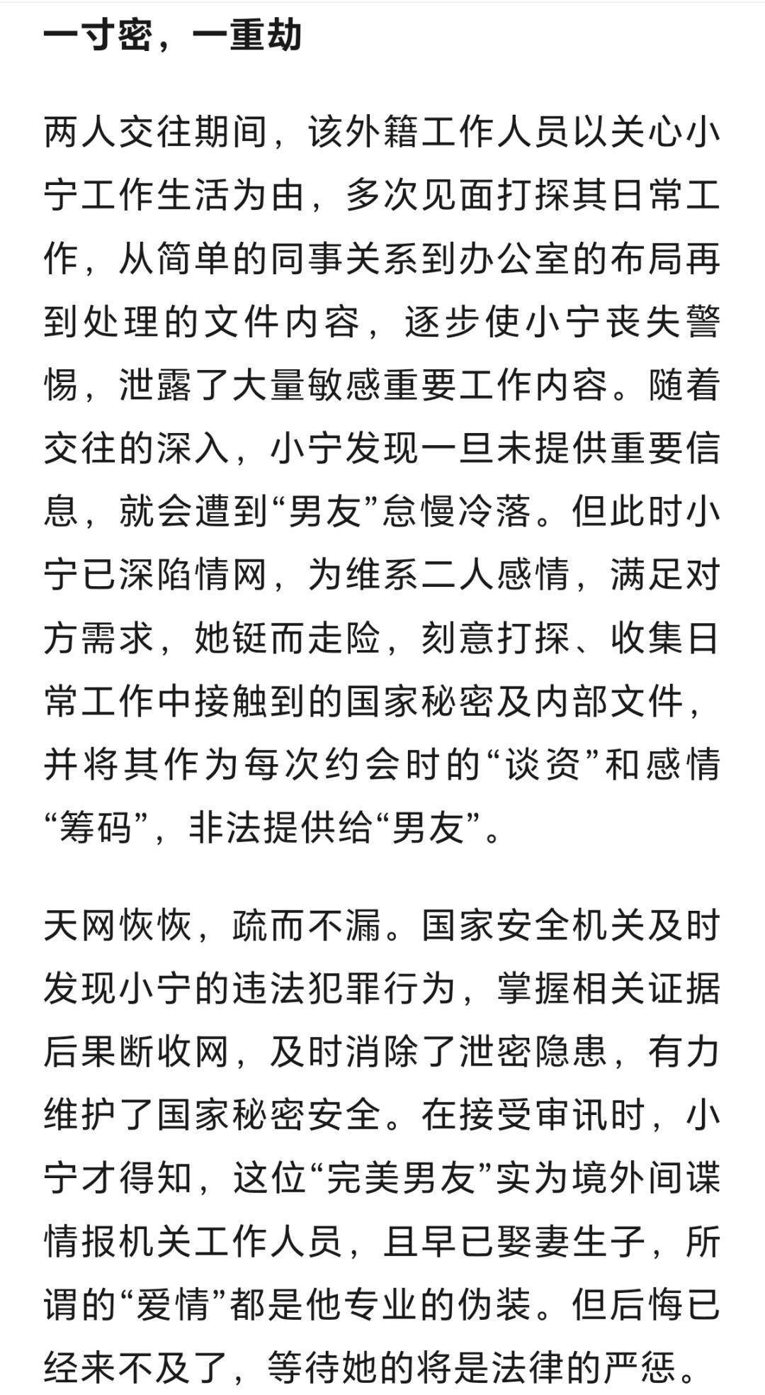 “他即是我的理思型,我认为爱情照进了我的施行,但莫得思到的是……”小宁坐在审讯椅上,手里攥着沾满泪水的纸巾,痛哭流涕地说说念。近日,国度安全机关破获一齐某机关单元责任主说念主员坠入境外间谍谍报机关责任主说念主员心境陷坑,欺骗职务之便为境外窃取、不法提供国度玄机的案件。
